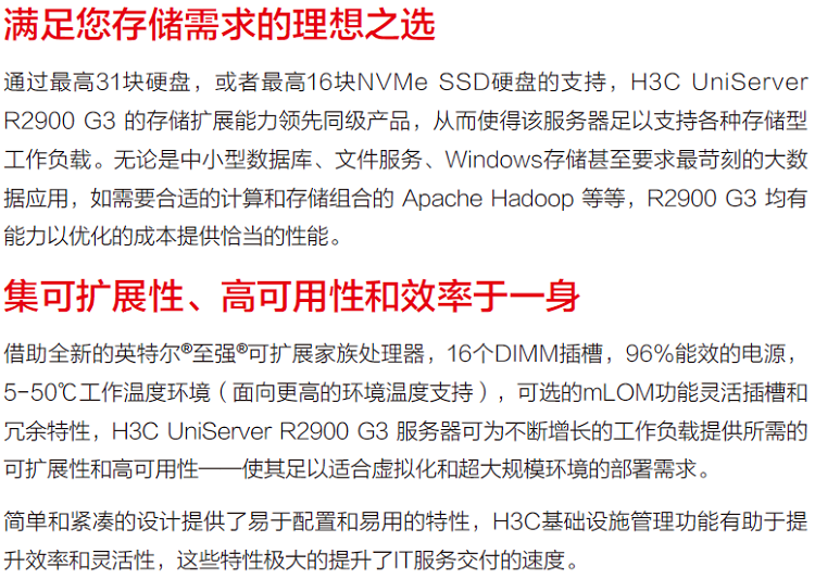 通過支持31塊硬盤,或者支持16塊NVMe SSD硬盤的支持,H3C UniServer R2900 G3 的存儲擴展能力領先同級產品,從而使得該服務器足以支持各種存儲型工作負載。無論是中小型數據庫、文件服務、Windows存儲甚至要求苛刻的大數據應用,如需要合適的計算和存儲組合的 Apache Hadoop 等等,R2900 G3 均有能力以優化的成本提供恰當的性能。