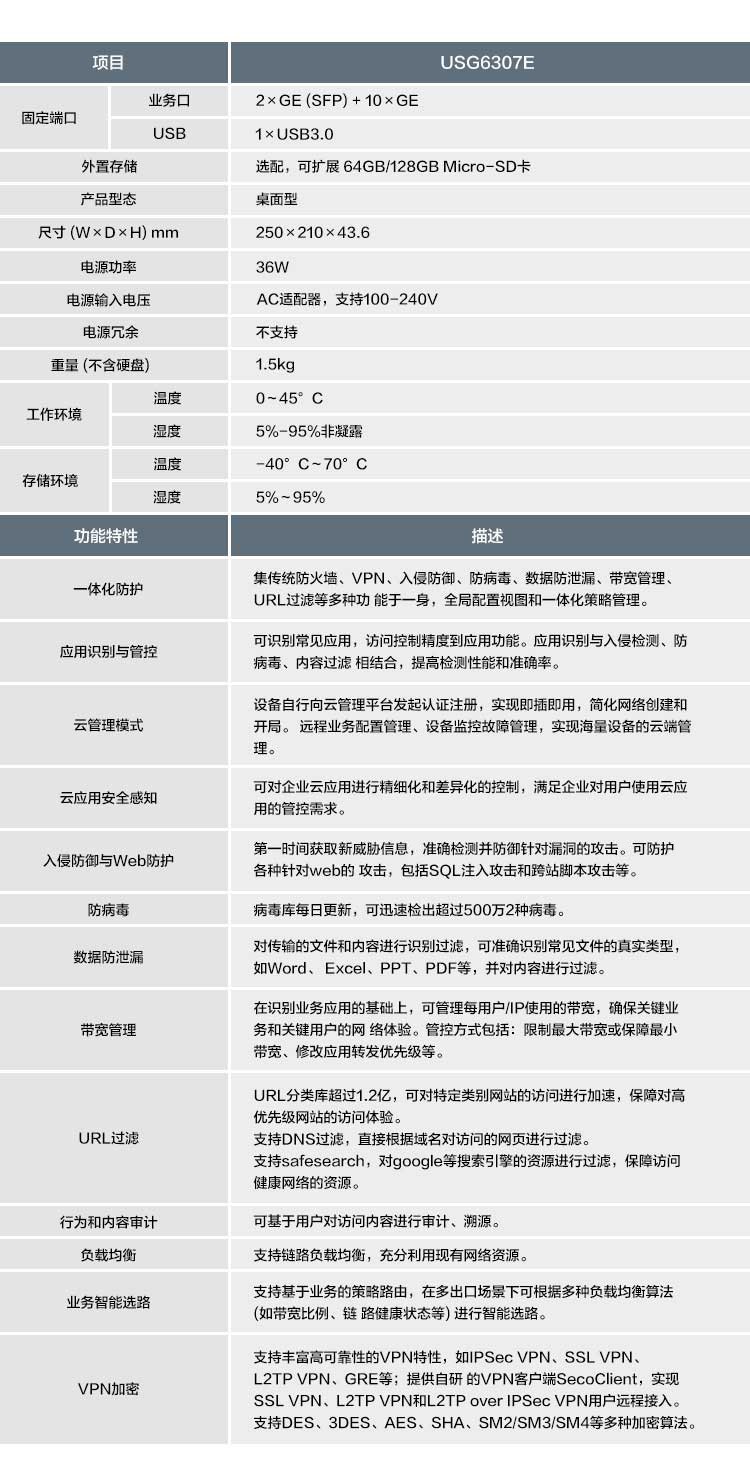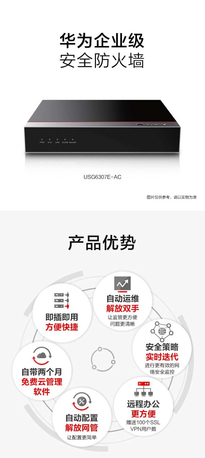 成都華為防火墻代理商 華為HUAWEI企業級千兆硬件防火墻USG6307E-AC 多WAN口核心VPN安全路由器網關 帶機量50 桌面型