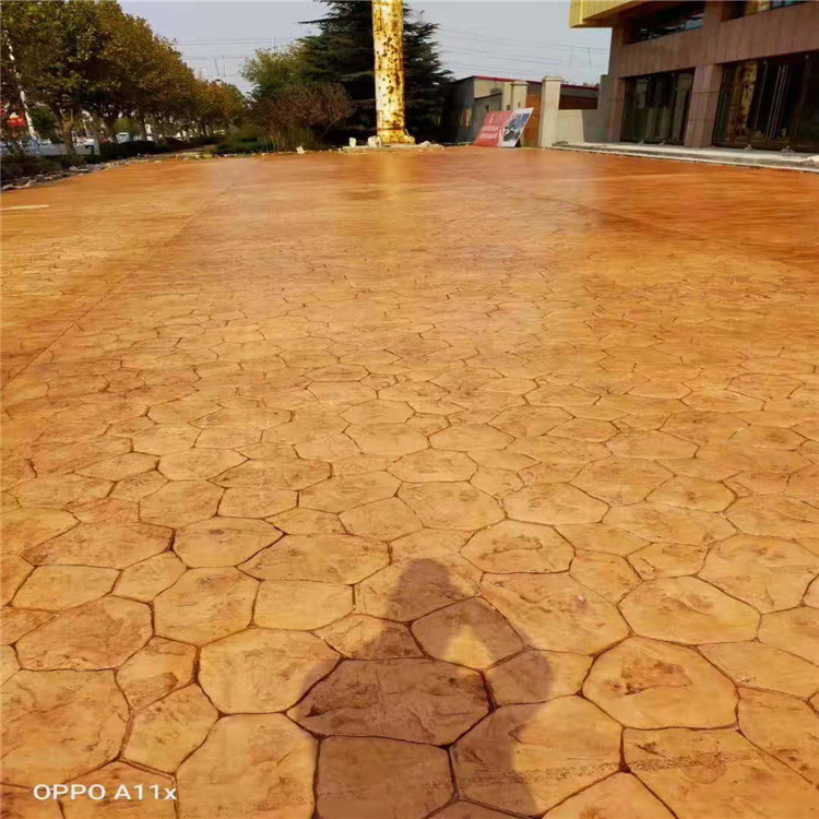 4、撒布藝術地坪彩色脫模粉。彩色藝術地坪脫模粉的撒布也應掌握好時機和均勻度。撒布脫模粉應在準備開始壓模時進行,由于該材料是輕質粉末,所以撒布的時候應該避開大風,并順風方向撒布。脫模粉的用量與均勻程度和施工人員撒布的熟悉程度有關。