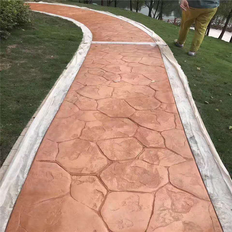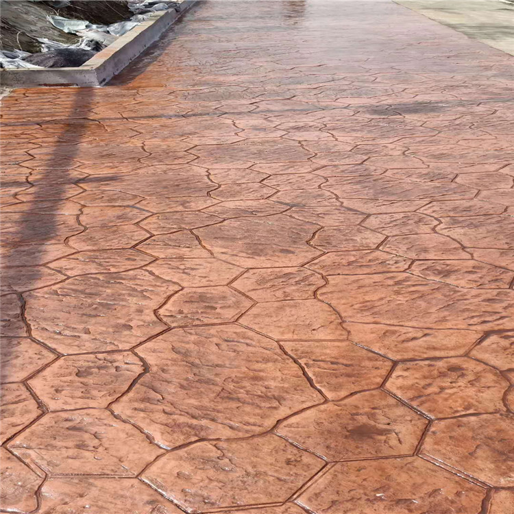 5、使用藝術地坪模具對地坪面層進行紋理處理。藝術地坪模具應配套使用,首先確定好紋理的分布方向,選好一塊模具放置的位置和角度,然后其它的模具依次緊貼一塊模具放置。彩色混凝土藝術地坪壓模采用壓模,壓模應由技術較好的人員進行作業以保證壓紋深度一致和模具放置的準確性。