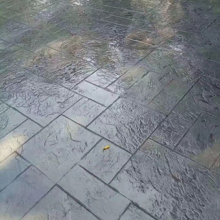 5、使用藝術地坪模具對地坪面層進行紋理處理。藝術地坪模具應配套使用,首先確定好紋理的分布方向,選好一塊模具放置的位置和角度,然后其它的模具依次緊貼一塊模具放置。彩色混凝土藝術地坪壓模采用壓模,壓模應由技術較好的人員進行作業以保證壓紋深度一致和模具放置的準確性。