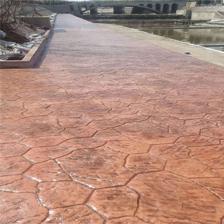 5、使用藝術地坪模具對地坪面層進行紋理處理。藝術地坪模具應配套使用,首先確定好紋理的分布方向,選好一塊模具放置的位置和角度,然后其它的模具依次緊貼一塊模具放置。彩色混凝土藝術地坪壓模采用壓模,壓模應由技術較好的人員進行作業以保證壓紋深度一致和模具放置的準確性。