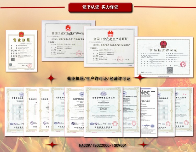 主要經(jīng)營:公司擁有調(diào)味品、方便食品、肉制品、蔬菜制品的生產(chǎn)資質(zhì)。主要產(chǎn)品覆蓋火鍋底料、辣椒紅油、干鍋香鍋底料、面食調(diào)料、粉類調(diào)料等標準化小調(diào)料包,以及酸辣粉、綿陽米粉、新疆炒米粉、自熱火鍋等方便食品的研發(fā)與定制。