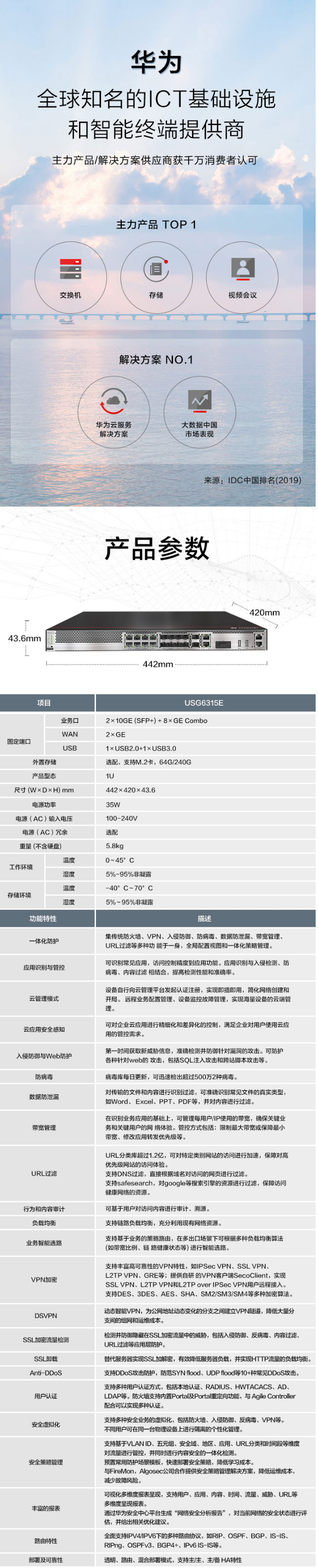 產品: 瀏覽次數:6成都華為防火墻授權經銷商_HUAWEI USG6300E系列AI防火墻企業級核心VPN千兆安全網關 USG6315E-AC 1U盒式 可升級SSL VPN