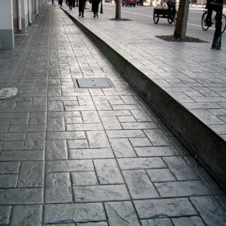 產品特點是能夠直接在混凝土上非常逼真地模仿許多建筑裝飾材料的質地及色澤,呈現出的效果酷似天然的青石板、木板、火山巖石等等。它能夠刻意表現出自然材質的粗礪,凹凸不平和復雜紋理,整體成型,一次性鋪裝,施工快,同時又解決了普通彩色道磚的整體性差,高低不平易松動,使用周期短等缺點。