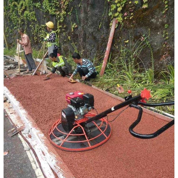 透水混凝土屬干性混凝土料,其初凝快,攤鋪必須及時。對于人行道面,大面積施工采用分倉方式進行攤鋪,其松鋪系數(shù)為1.1。將混合物均勻攤鋪在工作面上,用刮尺找準(zhǔn)平整度和控制一定的泛水度,用抹刀抹平,抹合不能有明水。