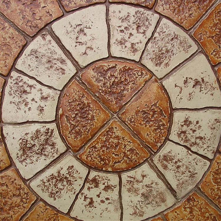 5、使用藝術地坪模具對地坪面層進行紋理處理。藝術地坪模具應配套使用,首先確定好紋理的分布方向,選好一塊模具放置的位置和角度,然后其它的模具依次緊貼一塊模具放置。彩色混凝土藝術地坪壓模采用壓模,壓模應由技術較好的人員進行作業以保證壓紋深度一致和模具放置的準確性。