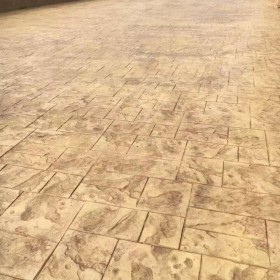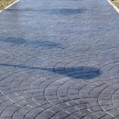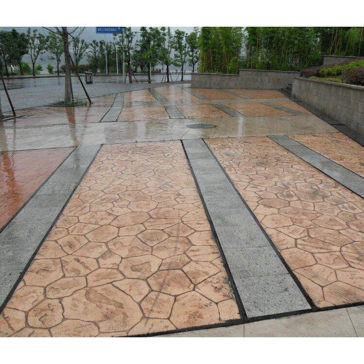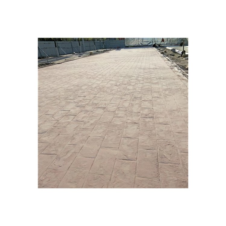 5、使用藝術地坪模具對地坪面層進行紋理處理。藝術地坪模具應配套使用,首先確定好紋理的分布方向,選好一塊模具放置的位置和角度,然后其它的模具依次緊貼一塊模具放置。彩色混凝土藝術地坪壓模采用壓模,壓模應由技術較好的人員進行作業(yè)以保證壓紋深度一致和模具放置的準確性。