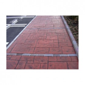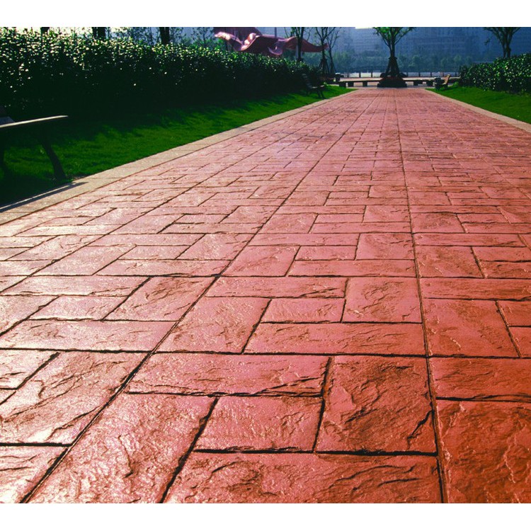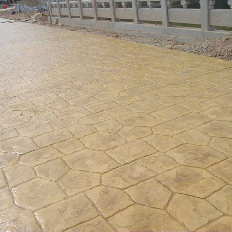 5、使用藝術地坪模具對地坪面層進行紋理處理。藝術地坪模具應配套使用,首先確定好紋理的分布方向,選好一塊模具放置的位置和角度,然后其它的模具依次緊貼一塊模具放置。彩色混凝土藝術地坪壓模采用壓模,壓模應由技術較好的人員進行作業以保證壓紋深度一致和模具放置的準確性。