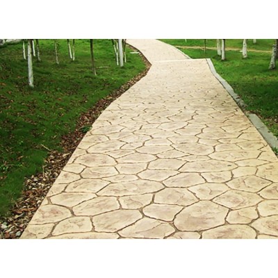 5、使用藝術地坪模具對地坪面層進行紋理處理。藝術地坪模具應配套使用,首先確定好紋理的分布方向,選好一塊模具放置的位置和角度,然后其它的模具依次緊貼一塊模具放置。彩色混凝土藝術地坪壓模采用壓模,壓模應由技術較好的人員進行作業以保證壓紋深度一致和模具放置的準確性。