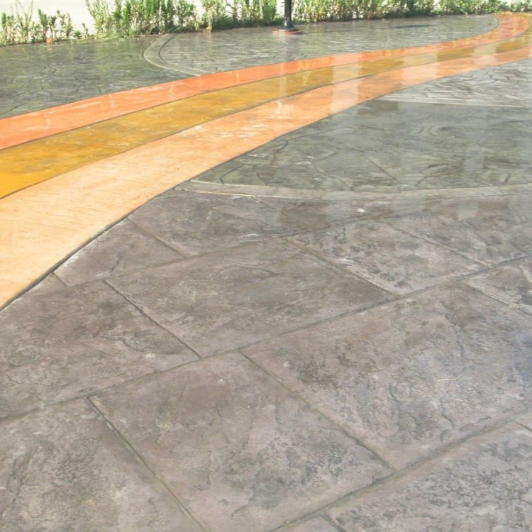 4、撒布藝術地坪彩色脫模粉。彩色藝術地坪脫模粉的撒布也應掌握好時機和均勻度。撒布脫模粉應在準備開始壓模時進行,由于該材料是輕質粉末,所以撒布的時候應該避開大風,并順風方向撒布。脫模粉的用量與均勻程度和施工人員撒布的熟悉程度有關。