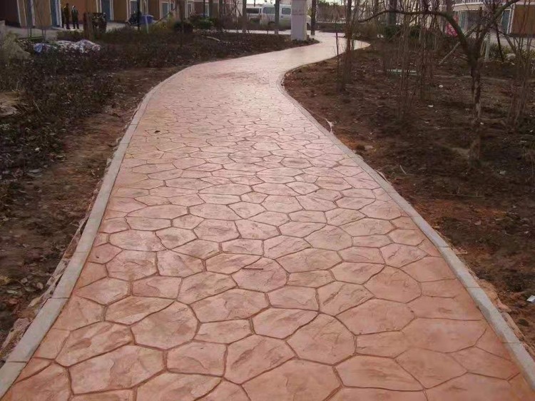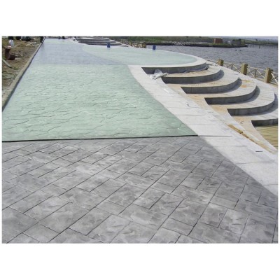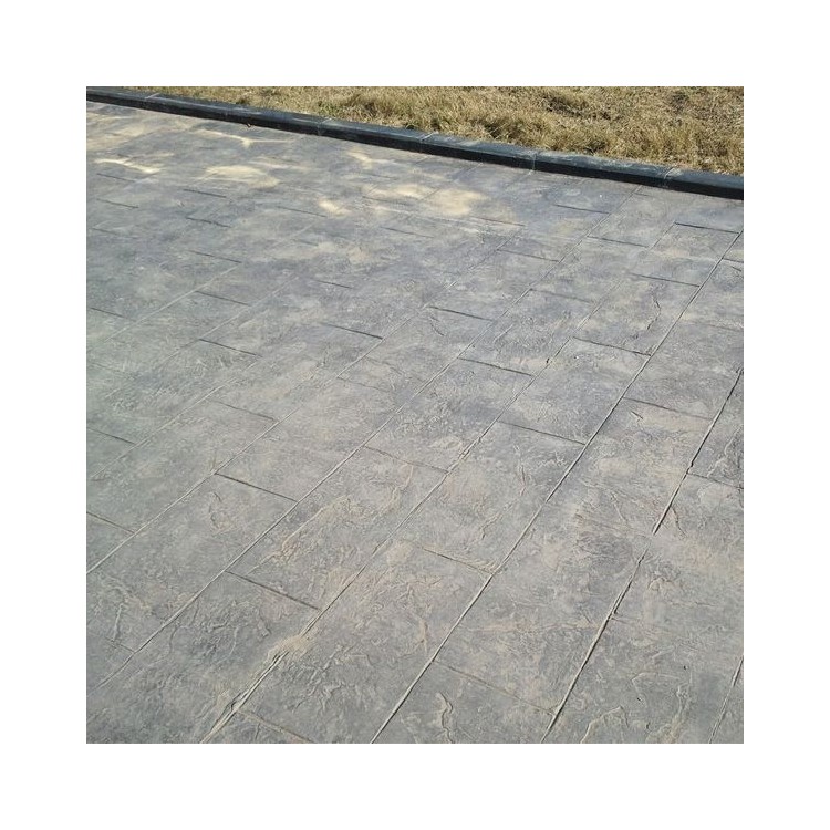 5、使用藝術地坪模具對地坪面層進行紋理處理。藝術地坪模具應配套使用,首先確定好紋理的分布方向,選好一塊模具放置的位置和角度,然后其它的模具依次緊貼一塊模具放置。彩色混凝土藝術地坪壓模采用壓模,壓模應由技術較好的人員進行作業以保證壓紋深度一致和模具放置的準確性。