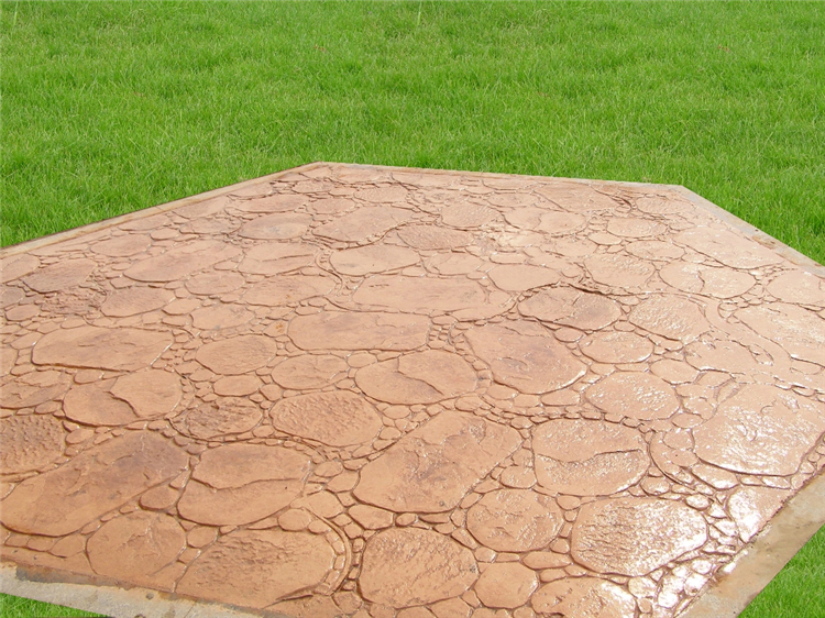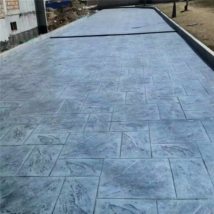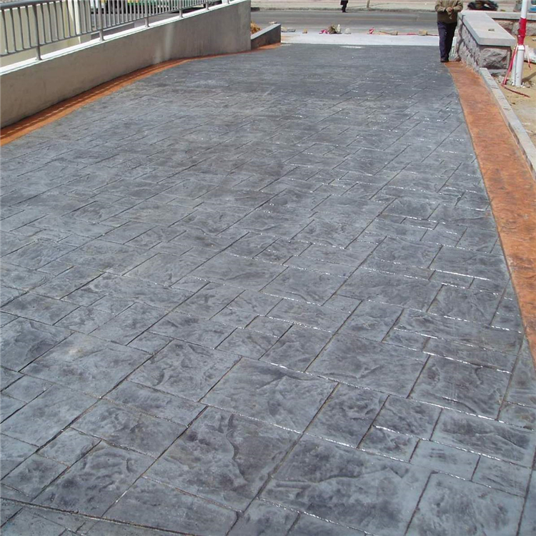 5、使用藝術地坪模具對地坪面層進行紋理處理。藝術地坪模具應配套使用,首先確定好紋理的分布方向,選好一塊模具放置的位置和角度,然后其它的模具依次緊貼一塊模具放置。彩色混凝土藝術地坪壓模采用壓模,壓模應由技術較好的人員進行作業以保證壓紋深度一致和模具放置的準確性。