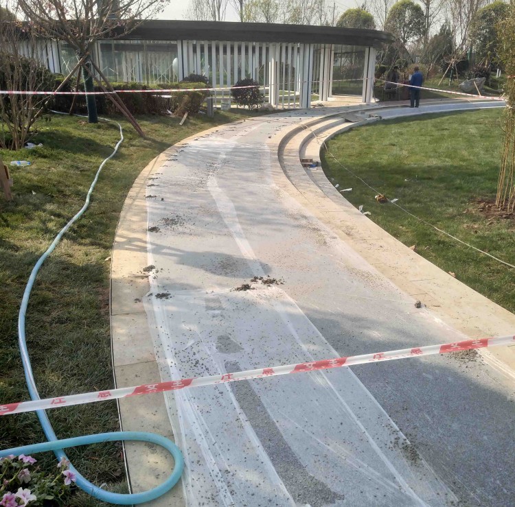 透水混凝土屬干性混凝土料,其初凝快,攤鋪必須及時。對于人行道面,大面積施工采用分塊隔倉方式進行攤鋪物料,其為1.1。將混合物均勻攤鋪在工作面上,用括尺找準平整度和控制一定的泛水度,然而(厚度厚的用平板振動器)搗實不宜采用,后用抹合拍平,抹合不能有明水。